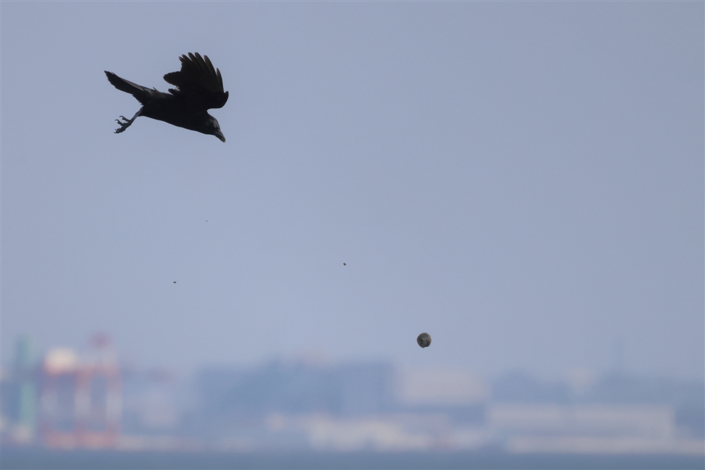 貝を5m程から投下。見まねで覚えるようですが硬い地面を使うとこまではいかず…。