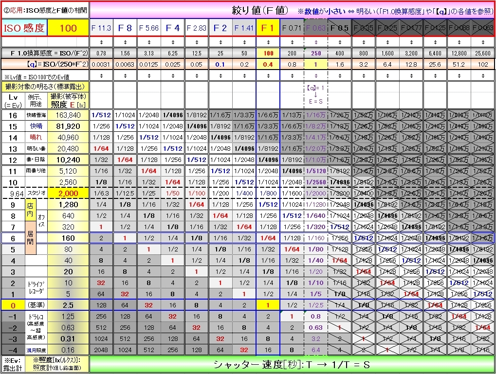 ISO100固定の、数十年前からの撮影条件相関表と同様の表