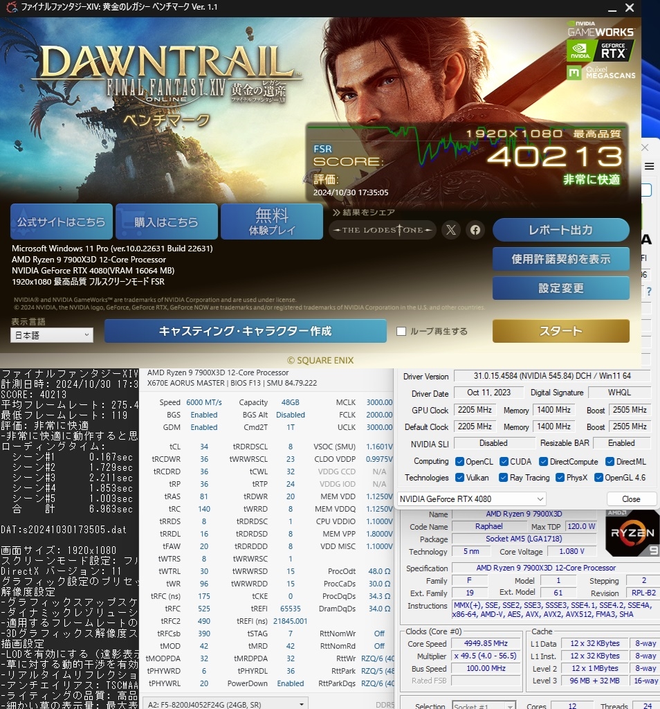 FF14黄金 7900X3D + 4080 GameRock 6000CL34(tRFC525) 27℃ 23H2