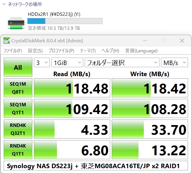 『CrystalDiskMark』Synology DiskStation DS223j 壊れた時計さんのクチコミ掲示板画像3/3