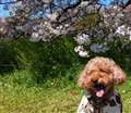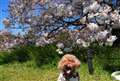 また、ピントがワンちゃんに合っているため、背景の桜はピントから外れてボケています。