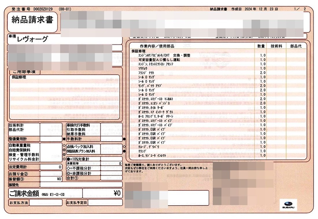 「エンジン交換」 スバル レヴォーグ レイバック 1701Fさんのクチコミ掲示板画像1/2