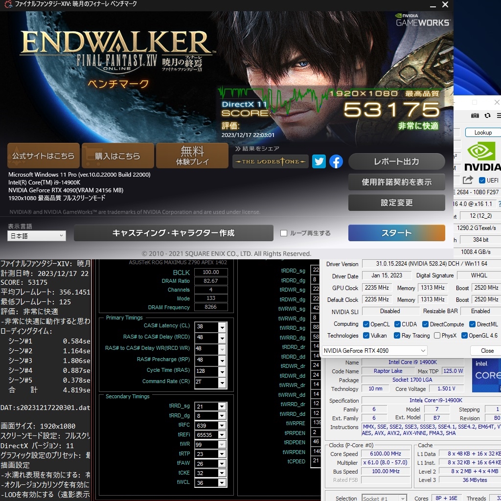 FF14暁月 14900K@6.1 + 4090 Phantom DDR5-8266CL38(tRFC 639) UnCore x52 11℃