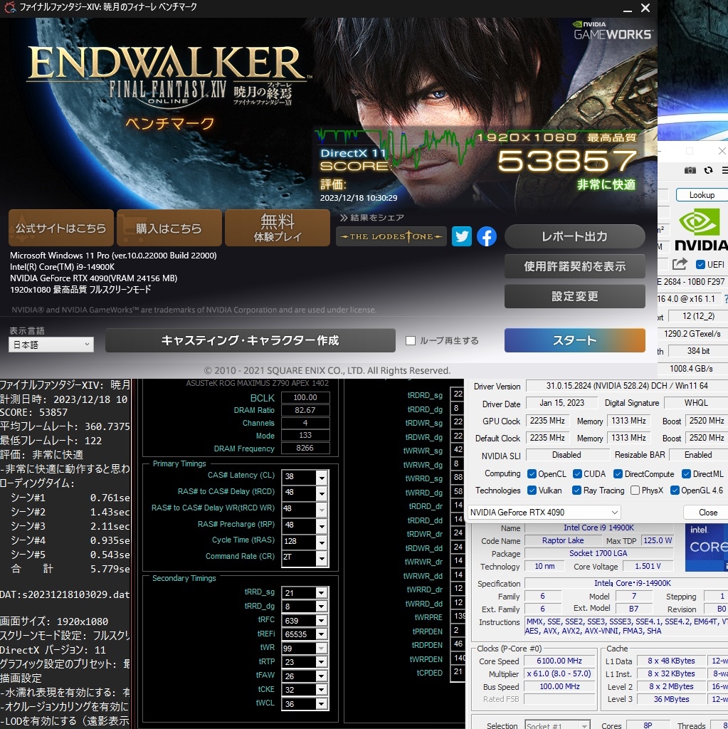 FF14暁月 14900K@6.1 + 4090 Phantom DDR5-8266CL38(tRFC 639) UnCore x52 APO化 13℃
