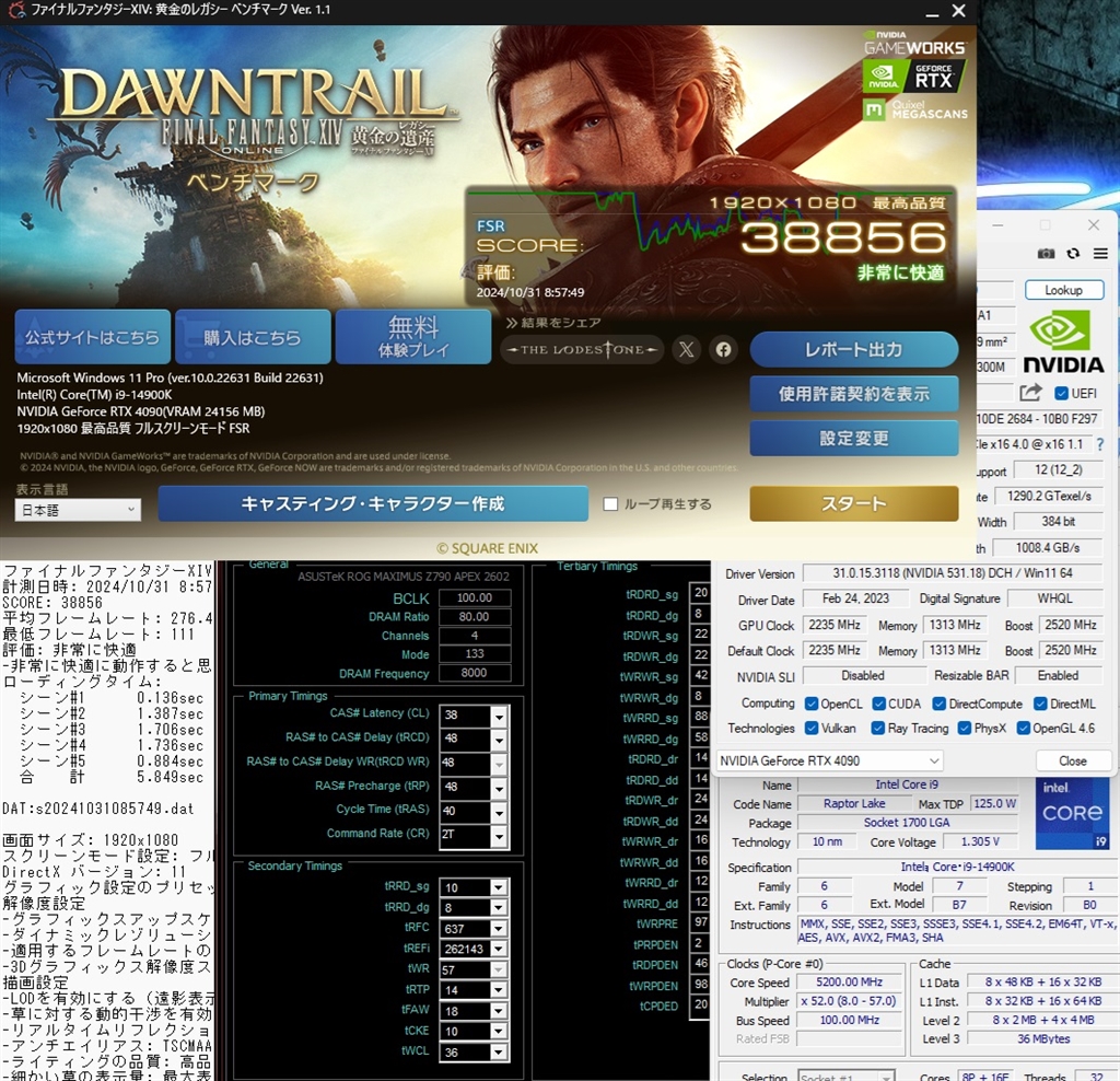 FF14黄金 14900K@5.2 + 4090 Phantom 21℃ 23H2 Uncore x49