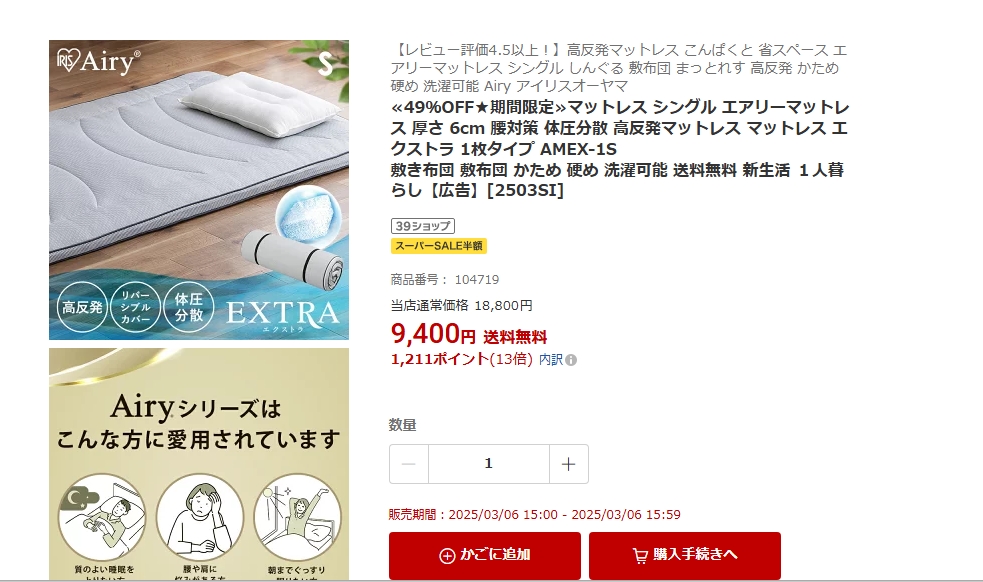 アイリスオーヤマ エアリーマットレス エクストラ 1枚タイプ AMEX-1S シングル まぐたろうさんのクチコミ掲示板画像1/1